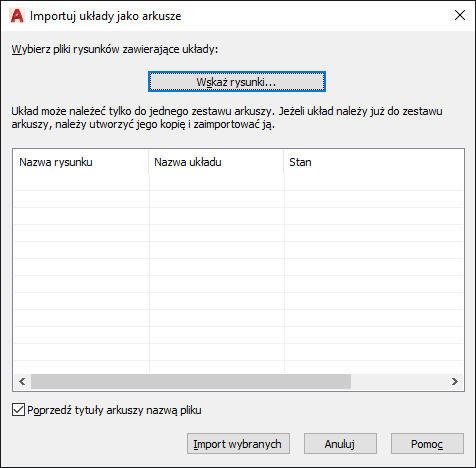 Umożliwia szybki import układów do zestawu arkuszy, i określa, która karta układu będzie użyta jako arkusz.