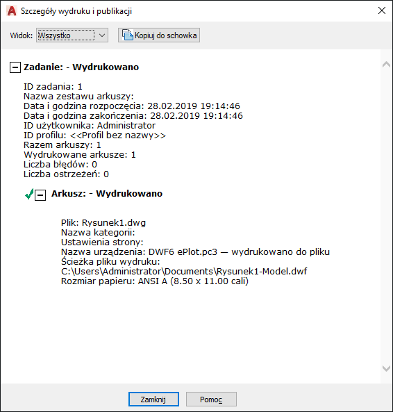 Wyświetla informacje dotyczące zadań drukowania i publikowania, które zostały zakończone w bieżącej sesji.