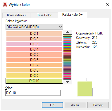 Jeżeli wybrana jest paleta kolorów, to karta Palety kolorów będzie wyświetlać nazwę wybranej palety kolorów.