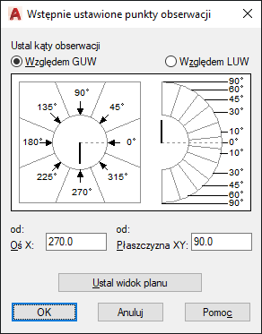 Ustala kierunek obserwacji względem układu współrzędnych układu GUW lub LUW.