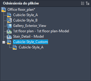 Na najwyższym poziomie drzewa znajduje się zawsze bieżący rysunek. Pliki odnośników są wyświetlane na następnym poziomie. Otwarcie plików odnośników, które zawierają własne zagnieżdżone odniesienia pliku, umożliwia wyświetlenie głębszych poziomów. W danej chwili w drzewie może być zaznaczony tylko jedno odniesienie pliku.