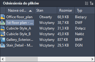 Pierwszym wpisem w kolumnie nazw odnośników jest zawsze bieżący rysunek, po którym następują dodatkowe dołączone pliki w kolejności ich dołączania.