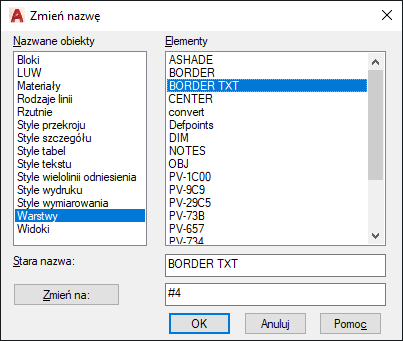 Zmienia nazwy przypisane takim elementom jak warstwy i style wymiarowania.