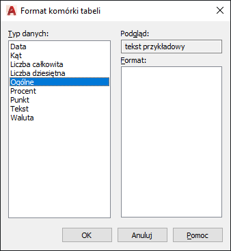 W zależności od wybranego typu danych wyświetla listę stosownych typów formatu. Na przykład, jeśli zostanie wybrany typ danych Kąt, wówczas zostaną wyświetlone opcje takie jak Stopnie dziesiętne, Grady, Radiany itp.