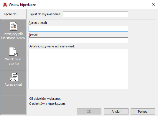 Tworzy listę ostatnio używanych adresów poczty elektronicznej, z których można wybrać jeden dla hiperłącza.