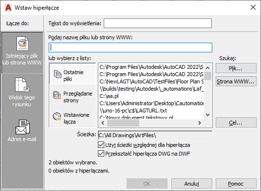 Wyświetla ścieżkę do pliku skojarzonego z hiperłączem. Jeśli wybrano opcję Użyj ścieżki względnej dla hiperłącza, na liście pojawia się tylko nazwa pliku. Jeżeli nie wybrano opcji Użyj ścieżki względnej dla hiperłącza, wyświetlana jest pełna ścieżka oraz nazwa pliku.