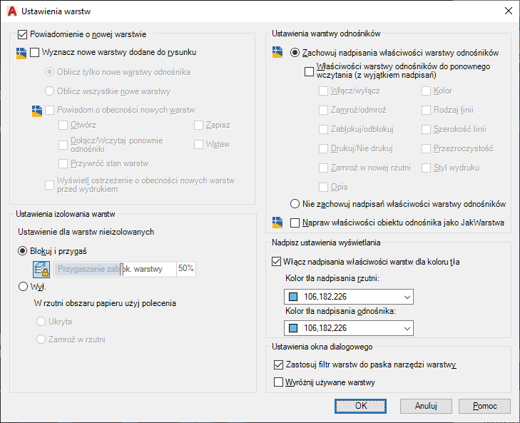 Kontroluje kiedy wyświetlane są powiadomienia o nowych warstwach, zachowanie, gdy niektóre warstwy są izolowane, czy filtry warstw są stosowane do paska narzędzi Warstwy, a także kolor tła nadpisań rzutni w Menedżerze właściwości warstw.