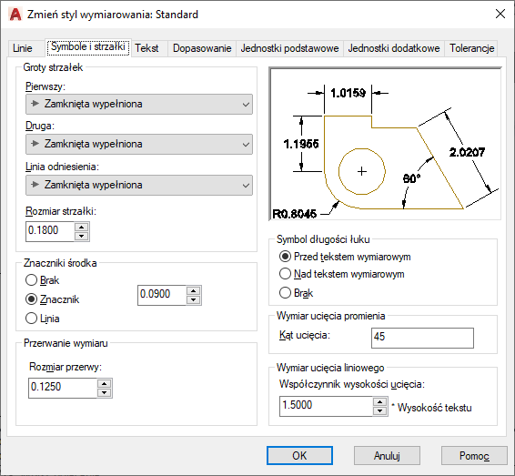 Ustala sposób wyświetlania symbolu długości łuku na wymiarze długości łuku. (DIMARCSYM — zmienna systemowa)