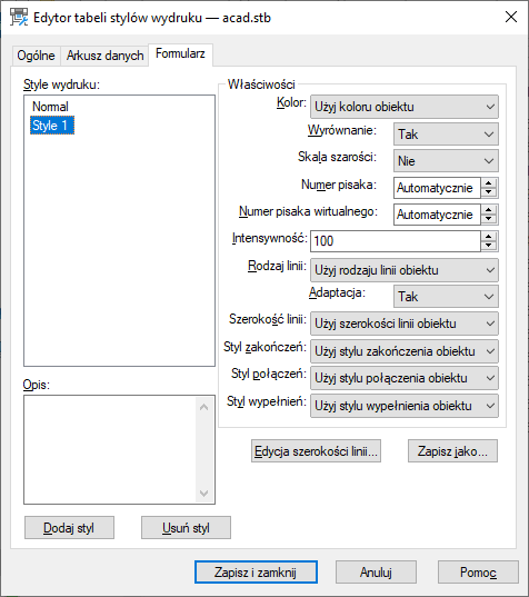 W przypadku przypisania szerokości linii stylu wydruku zastąpi ona szerokość linii obiektu podczas wydruku.