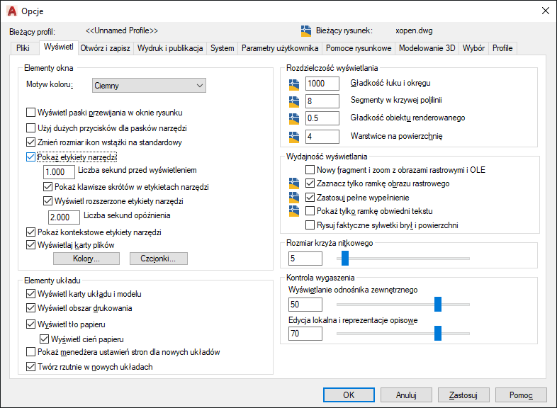 Steruje przyciemnianiem wszystkich obiektów odnośników DWG. (XDWGFADECTL — zmienna systemowa)
