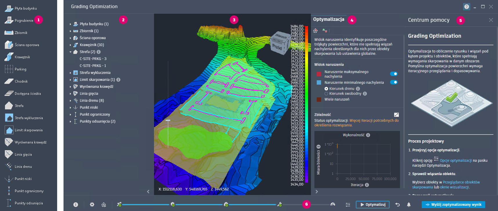 Centrum pomocy — ten panel zawiera wskazówki kontekstowe podczas pracy w rozszerzeniu Grading Optimization. Dostępne są również procesy projektowe, przykładowe rysunki i łącza do odpowiednich materiałów szkoleniowych.
