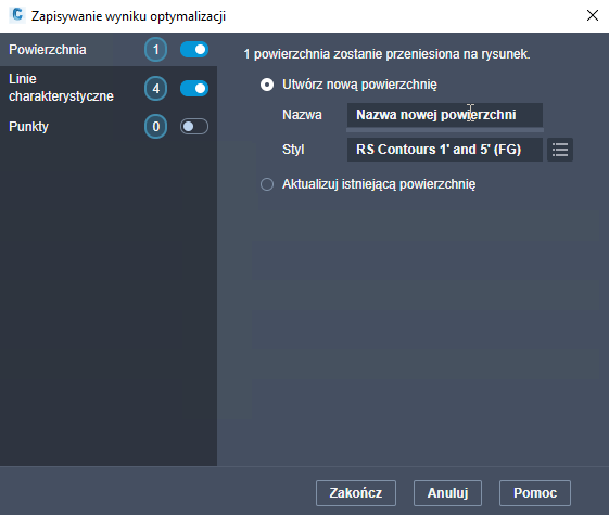 Aby wysłać powierzchnię z utworzonym skarpowaniem do programu Civil 3D, kliknij przycisk Wyślij zoptymalizowany wynik na dolnym pasku narzędzi. W programie Civil 3D powinno zostać wyświetlone nowe okno. Zoptymalizowaną powierzchnię można przenieść do rysunku jako nową powierzchnię lub użyć do zaktualizowania istniejącej powierzchni.