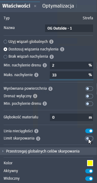 Po zdefiniowaniu i edycji obiektów skarpowania wybierz narzędzie Optymalizuj z panelu Grading Optimization. Rozszerzenie Grading Optimization zostanie wyświetlone w osobnym oknie.