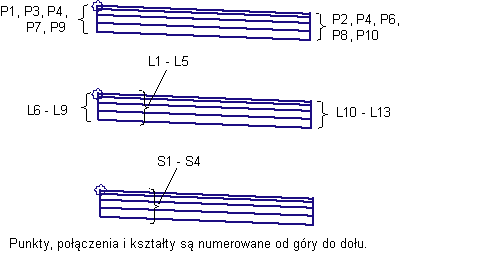 W następującej tabeli wymieniono kody kształtów, połączeń i punktów dla tych podzespołów, do których przypisano kody. Kody kształtu, połączeń i punktów dla tych podzespołów, do których nie przypisano kodów, nie zostały uwzględnione w tej tabeli.