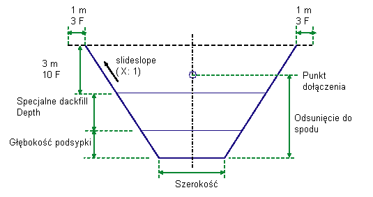 Obliczana jest rzędna spodu rowu jako rzędna linii nachylenia profilu pomniejszona o wartość Odsunięcia do spodu. Na tej rzędnej, symetrycznie względem odsunięcia punktu dołączenia, umieszczane jest poziome połączenie spodu rowu i wydłużane są w górę, do istniejącej powierzchni, stoki boczne. Nad spodem rowu, zgodnie z daną głębokością, umieszczane jest poziome połączenie Podłoża. Nad połączeniem Podłoża, zgodnie z daną głębokością, umieszczane jest poziome połączenie Specjalnej zasypki.
