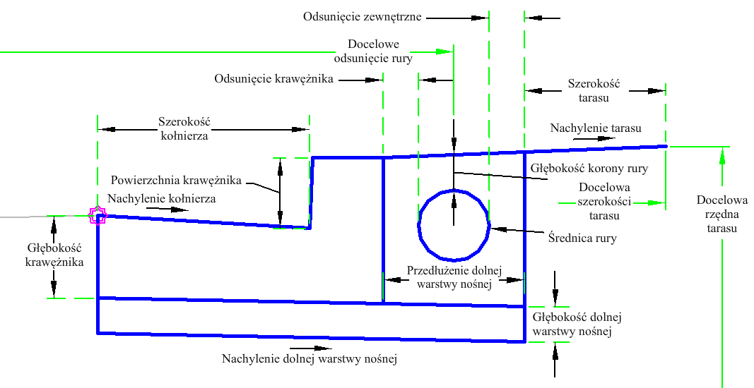 Podzespół CurbOffsetPipe służy do wstawiania krawężnika i koryta ściekowego z rurą za krawężnikiem i korytem ściekowym. Za krawężnikiem umieszczany jest również taras.