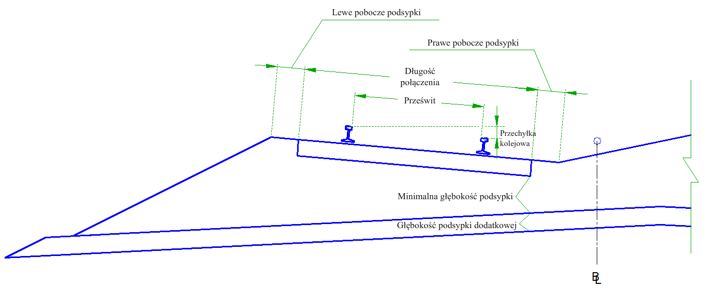 Wartość minimalnej głębokości podsypki jest stosowana w położeniu minimalnego prześwitu pomiędzy podkładem a podsypką dodatkową. Parametr Skos górny podsypki dodatkowej niezależnie steruje skosem górnym podsypki dodatkowej. Parametr Linia bazowa do korony podsypki dodatkowej steruje położeniem korony podsypki dodatkowej.