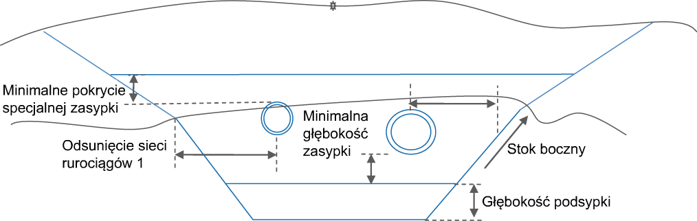 W przypadku wybrania dwóch sieci rurociągów przyjmuje się, że Sieć rurociągów 1 znajduje się po lewej stronie linii bazowej, a Sieć rurociągów 2 — po prawej stronie linii trasowania. Głębokość materiału Minimalnej głębokości specjalnej zasypki jest określana za pomocą wyższej z dwóch górnych zewnętrznych średnic rur dodanej do wartości Minimalnego pokrycia specjalnego zasypki. Dno rowu jest określane za pomocą niższej z dwóch dolnych zewnętrznych średnic rur dodanej do Minimalnej głębokości specjalnej zasypki i dodanej do Głębokości podsypki.