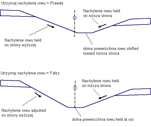 Przechyłka lub pasy do skręcania mogą spowodować, iż góra nachyleń rowu będzie miała różne rzędne z lewej i prawej strony, co doprowadzi do powstania rowu asymetrycznego. Istnieją dwie procedury postępowania w tej sytuacji. Jeśli parametr Utrzymaj nachylenie rowu ma wartość Prawda, wówczas z obu stron utrzymywane są stałe nachylenia rowu, co powoduje odsunięcie spodu rowu od osi w kierunku niższej strony. Jeśli parametr ten ma wartość Fałsz, spód rowu jest wyśrodkowany względem osi pasa rozdzielającego oraz utrzymywane jest określone nachylenie niższej strony i dopasowywane jest nachylenie strony wyższej.
