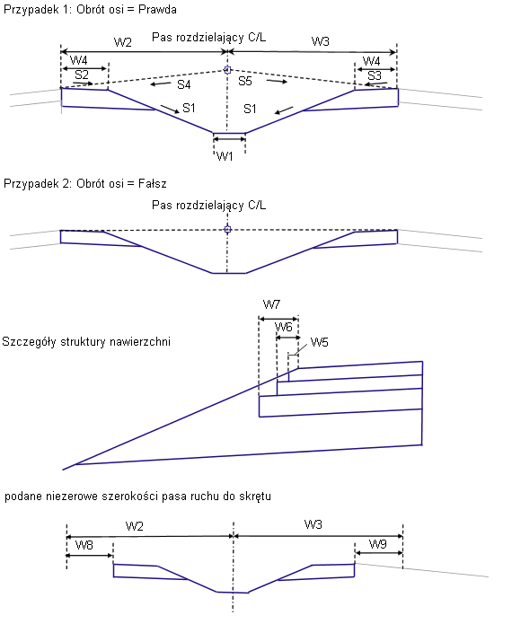 Ten podzespół działa tylko z typami jezdni, które mają metody obrotu krawędzi pasa rozdzielającego i obróbkę pasa rozdzielającego z zachowaniem kształtu pasa rozdzielającego. Użycie tego podzespołu z inną metodą obrotu lub z obróbką zniekształconego pasa rozdzielającego da wynik równoważny z parametrem krawędzie pasa rozdzielającego z zachowaniem kształtu pasa rozdzielającego.