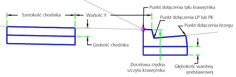 | Punkt dołączenia | Określa lokalizację punktu dołączenia krawężnika. | Brzeg/Tył krawężnika/Linia przepływu/powierzchnia | Brzeg |