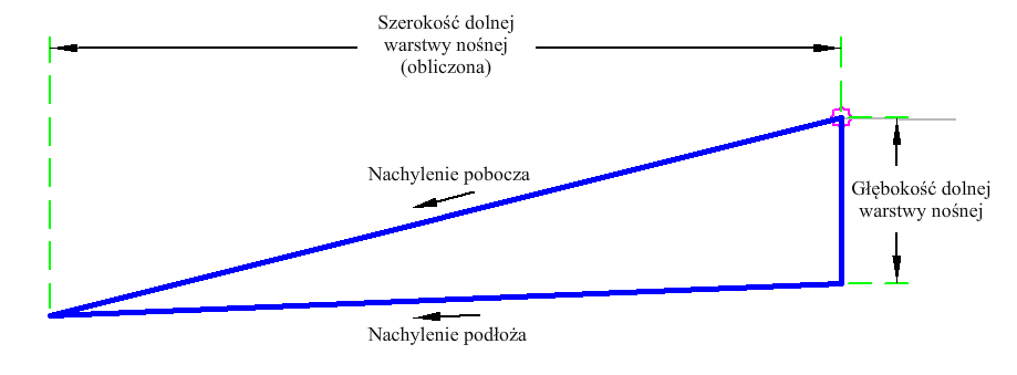 Podzespół ShoulderIntersectLeft umożliwia utworzenie pobocza rozciągniętego do punktu rzutowania na podstawie danych nachylenia pobocza i podłoża. Działa on tylko po lewej stronie.
