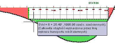 Zauważmy, że jest to miejsce w pobliżu punktu, w którym objętość transportowana na odkład (czerwona) i objętość transportowana na miejscu (zielona) stykają się z linią wykresu transportu robót ziemnych. Sprawdzenie tej pikiety na profilu pozwoli stwierdzić, że jest to względnie płaski fragment istniejącej powierzchni terenu. Płaski obszar jest dobrą lokalizacją na usypisko i urobisko.