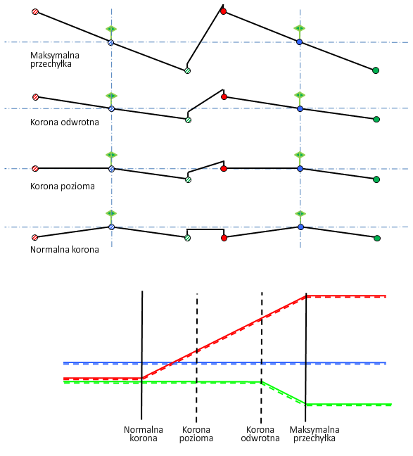 Objaśnienia do diagramów przechyłki zawiera temat Informacje o metodach obrotu osi przechyłki.