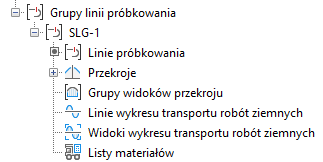 Kolekcja Grupy linii próbkowania umożliwia dostęp do linii próbkowania, przekrojów, widoków przekroju, linii wykresu transportu robót ziemnych, widoków wykresu transportu robót ziemnych oraz list materiałów na rysunku.