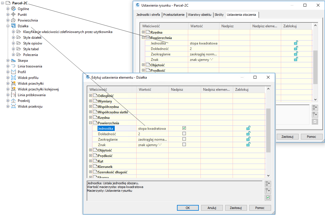 Dla każdego obiektu na niższym poziomie w hierarchii ustawień można określić dziedziczenie ustawień z wyższego poziomu lub je zastąpić. Poniższe ilustracje pokazują zestaw nadpisań dla jednostek powierzchni na poziomie cechy Działki.