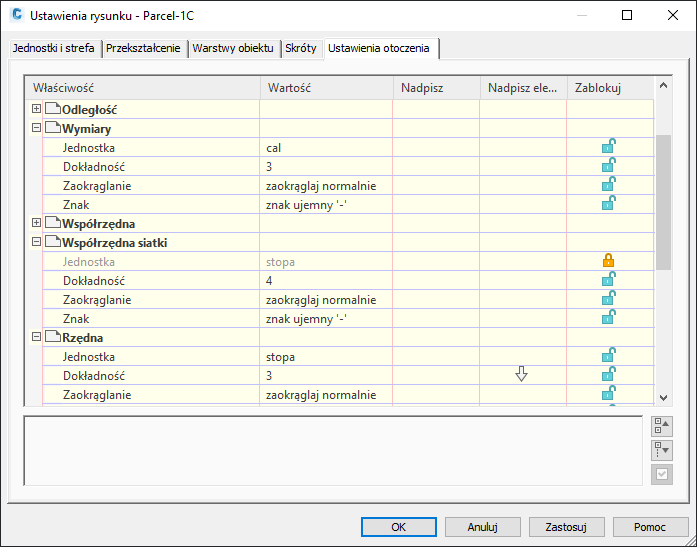 Ustawienia otoczenia skonfigurowane na poziomie rysunku są dostępne na poziomie elementów na liście i można je tam korygować.