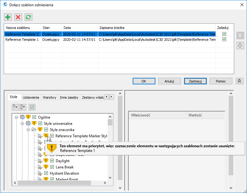 W przypadku dołączenia dodatkowego szablonu i wykrycia duplikatów, komponenty z konfliktami są oznaczone symbolami ostrzegawczymi i etykietami narzędzi.