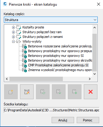 W oknie dialogowym można wybrać do dalszej pracy katalog rur albo katalog struktur i nawigować po kategoriach w ramach wybranego katalogu.