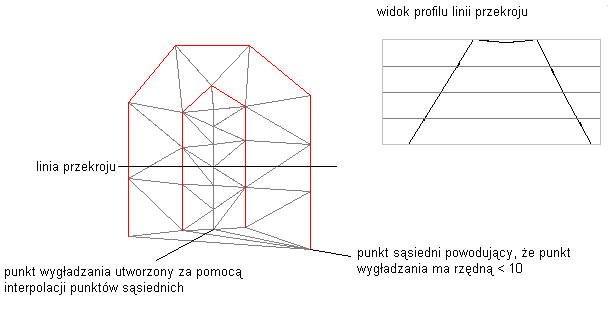 Uzyskane wyniki spowodowane są stosowaniem sąsiednich punktów przy interpolacji NNI do określania odpowiedniej rzędnej nowego punktu. Ponieważ wszystkie rzędne sąsiednich punktów są mniejsze niż rzędna trójkąta płaskiego, są one wybierane dla dodawanych punktów, co powoduje obniżenie grzbietu.