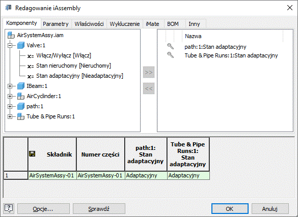 zbiór możliwych wymian przewodów rurowych w tabeli konfiguracji, używając polecenia Ustal adaptację. Jeśli polecenie Ustal adaptację nie zostanie zastosowane, główny zespół przebiegów będzie się zachowywał jak normalny komponent Inventor, nie będzie konfigurowalny i będzie współdzielony w generatorze iAssembly. W tym wypadku główny zespół przebiegów może być adaptacyjny tylko w jednym elemencie iAssembly, inaczej pozostanie nieadaptacyjny w całym generatorze iAssembly przewodów rurowych.