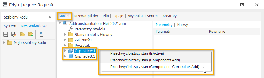 Krok 2 W pliku zespołu, w oknie dialogowym Edycja reguły, na karcie Model dokonaj wielokrotnego wyboru nazw części, kliknij prawym przyciskiem myszy, a następnie z menu kontekstowego wybierz pozycję Capture.Current.State (Components Constraints.Add). |