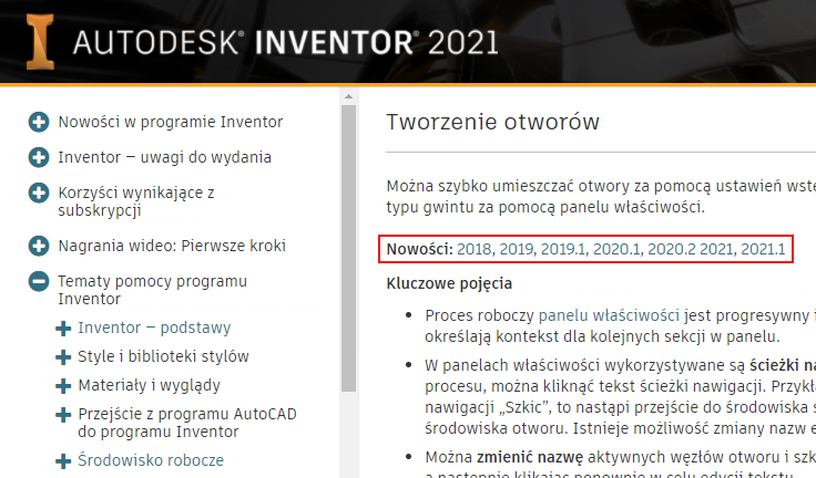 Ponadto w przypadku użycia klawisza F1 w celu przejścia do strony pomocy, gdy ma to zastosowanie, u góry strony widać łącza do tematu Nowości z wyjaśnieniem zmiany w funkcji lub poleceniu.