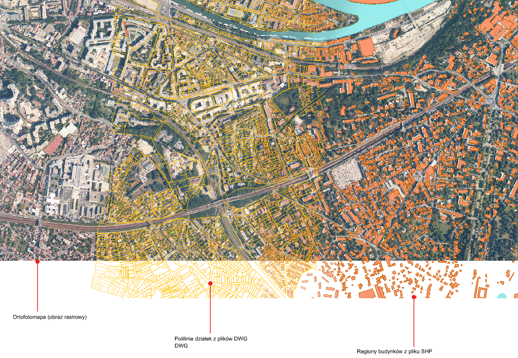 Ta mapa zawiera obraz rastrowy (fotografię), dane budynków zapisane w pliku SHP i dane działek zapisane w pliku DWG.