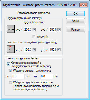Zdefiniowane mogą zostać graniczne przemieszczenia (ugięcia pręta w kierunku Y i Z , przemieszczenia węzłów w kierunku X i Y) oraz dodatkowo, przy określaniu granicznych ugięć pręta, może zostać określone, czy pręt jest wspornikiem.
