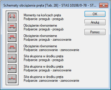 Opcje w tym oknie dialogowym są używane do definiowania wzoru rozkładu momentów zginających na długości analizowanego elementu. Informacja ta jest używana do kontroli stateczności elementów wystawionych na jednoczesne działanie sił ściskających i momentów zginających (zobacz punkt 8.2).