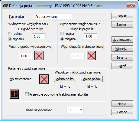 Użyj tej opcji, aby zdefiniować parametry typu pręta drewnianego dla normy ENV 1995-1:1:1992 NAD Finlandia.