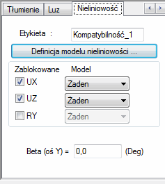 Naciśnięcie klawisza Definicja modelu nieliniowości powoduje otwarcie okna dialogowego umożliwiającego definicję krzywej określającej nieliniowy charakter kompatybilności. Krzywe zdefiniowane w oknie dialogowym Definicja modelu nieliniowego będą widoczne w listach wyboru znajdujących się w powyższym oknie dialogowym. Nieliniowe zachowanie węzłów kompatybilnych będzie definiowane przez wybór dla danego stopnia swobody modelu nieliniowości opisującego jedną z zależności: przemieszczenie—siła lub obrót—moment. Wybór modelu będzie możliwy dopiero po zablokowaniu odpowiedniego kierunku.