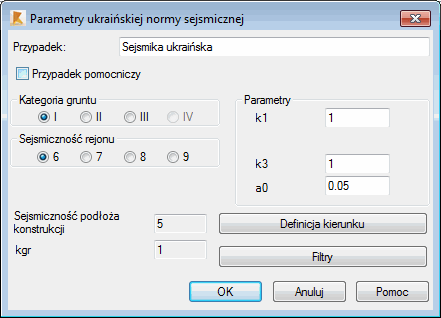 Parametry analizy sejsmicznej konstrukcji zależą od wyboru normy sejsmicznej, która będzie wykorzystywana podczas obliczeń konstrukcji poddanej wpływom obciążeń sejsmicznych. Po wyborze ukraińskiej normy sejsmicznej w oknie dialogowym Nowy przypadek lub naciśnięciu przycisku Parametry w oknie Typ analizy na ekranie pojawia się okno dialogowe pokazane poniżej.