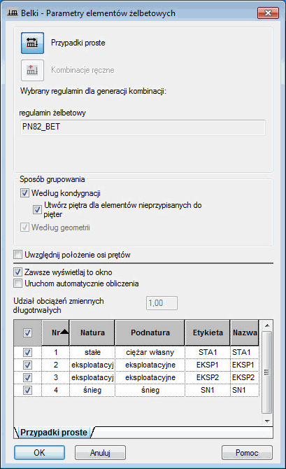 • Wybierz opcję Przypadki proste, aby dokonać obliczeń zgodnie z kombinacjami normowymi według reguł wymiarowania żelbetowych elementów konstrukcji. Znajduje się ona w pliku *.rgl w folderze CFG.