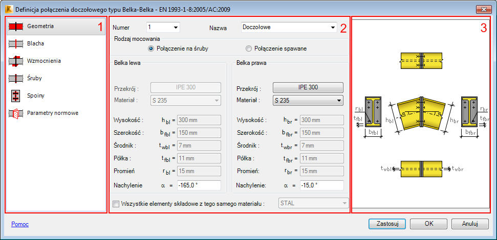 Okno dialogowe do generacji połączenia belka-belka (z blachą doczołową) można podzielić na trzy zasadnicze części: