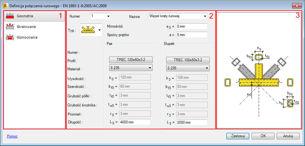 Okno dialogowe do generacji połączenia dla węzła kratownicy (profile rurowe) można podzielić na trzy zasadnicze części: