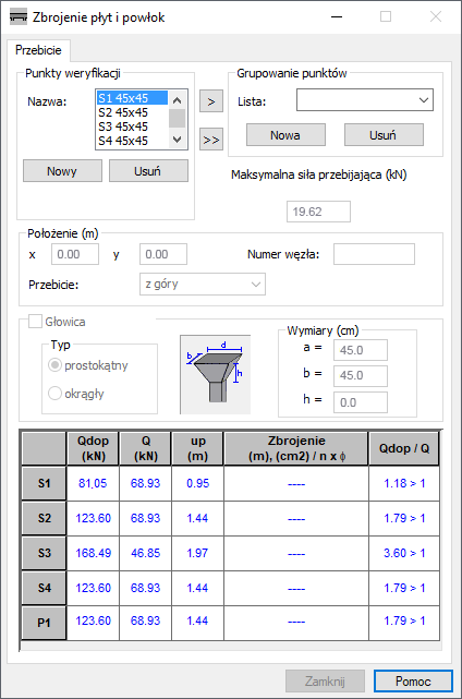 Aby zdefiniować nowy punkt weryfikacji, należy w polu Punkty weryfikacji nacisnąć przycisk Nowy. Za każdym razem po wykonaniu tej czynności do listy z punktami weryfikacji dopisywany jest punkt weryfikacji oznaczony literą P i kolejnym numerem porządkowym. Po wyborze punktu weryfikacji aktywne stają się pola umożliwiające definicję położenia punktu, geometrii obciążenia oraz wartości siły przebijającej. Wartości te są na bieżąco zapisywane (niewymagana jest żadna dodatkowa czynność, aby je zatwierdzić). Aby usunąć dodany punkt weryfikacji, należy go wybrać i nacisnąć przycisk Usuń. Nie można usunąć punktów, które są podporami zdefiniowanymi w geometrii konstrukcji (oznaczonych literą S).