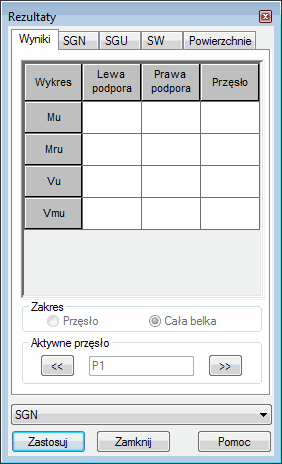 Karta składa się z tabeli, w której wyświetlane są wartości numeryczne wybranych do prezentacji wielkości. Zawartość tabeli zależy od kategorii wyników wybranych z listy rozwijanej w dolnej części okna dialogowego oraz wyboru aktywnego przęsła (w przypadku wieloprzęsłowej belki-ściany). Typ i zakres wyświetlanych wyników zależny jest także od ustawień na pozostałych kartach okna dialogowego Wykresy.