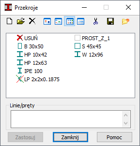- Pole listy aktywnej – Lista przekrojów definiowanych przez użytkownika. Przekroje z tej listy mogą zostać przypisane prętom konstrukcji.