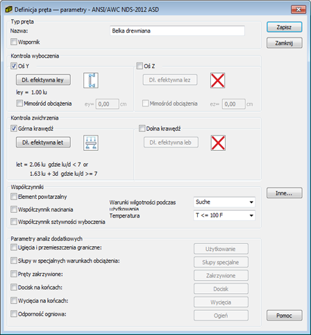 Użyj tego okna dialogowego, aby zdefiniować parametry normowe elementu zgodnie z normą ANSI/AWC NDS 2012, zarówno dla postaci ASD, jak i LRFD.